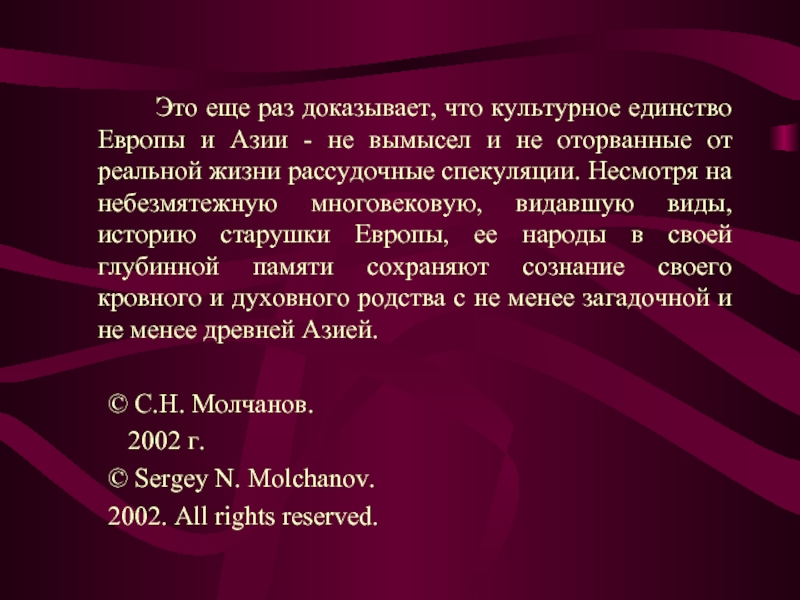 культурное единство Европы и Азии - не вымысел и не оторванные от реальной жизни рассудочные спекуляции. Несмотря на небезмятежную многовековую, видавшую виды, историю старушки Европы, ее народы в своей глубинной памяти сохраняют сознание своего кровного и духовного родства с не менее загадочной и не менее древней Азией.
