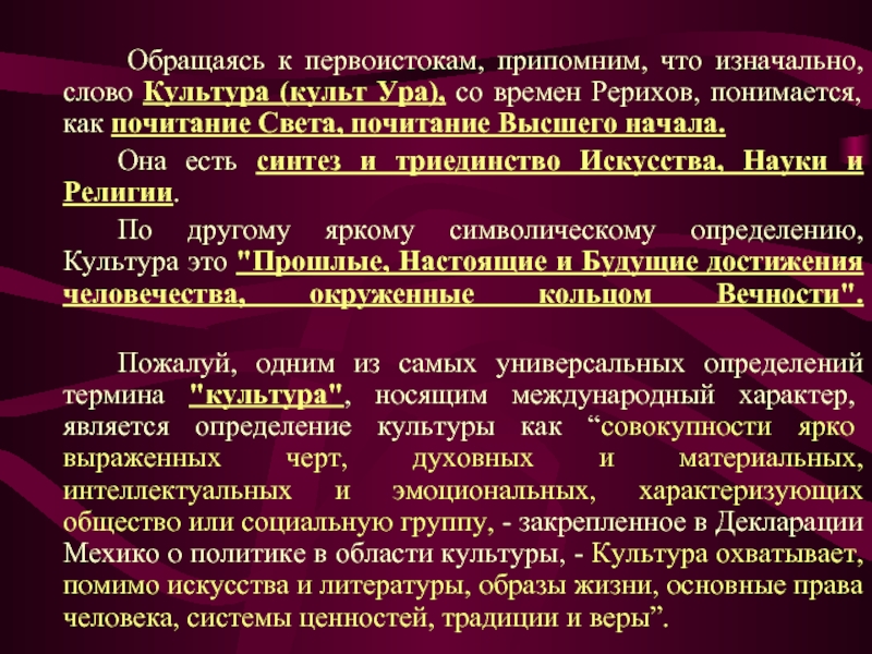 что изначально, слово Культура (культ Ура), со времен Рерихов, понимается, как почитание Света, почитание Высшего начала.