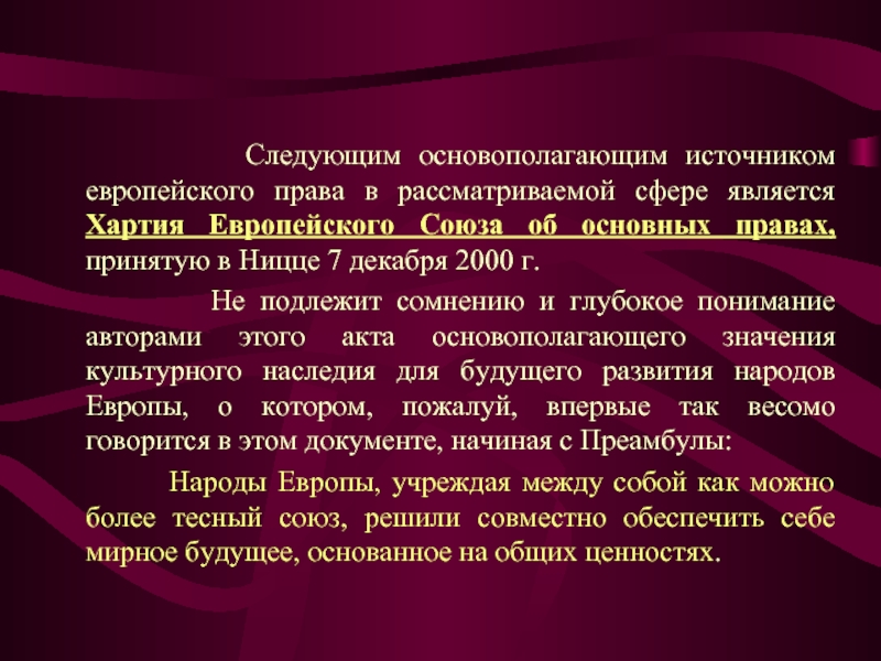 Проведенный выше анализ уже позволяет говорить о наличии сформировавшегося культурного права Европы (European Cultural Law) как отрасли европейского права и, возможно, как отрасли европейской правовой науки.