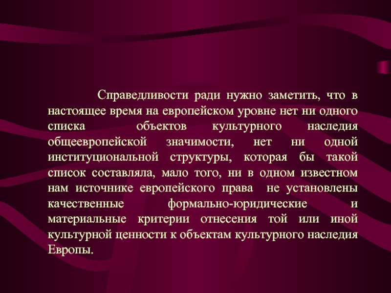 в настоящее время на европейском уровне нет ни одного списка объектов культурного наследия общеевропейской значимости, нет ни одной институциональной структуры, которая бы такой список составляла, мало того, ни в одном известном нам источнике европейского права не установлены качественные формально-юридические и материальные критерии отнесения той или иной культурной ценности к объектам культурного наследия Европы.