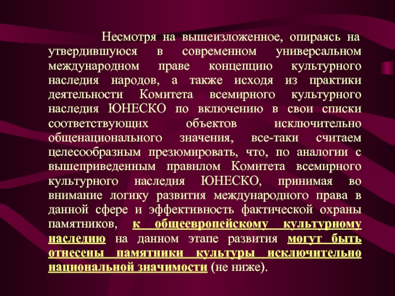на утвердившуюся в современном универсальном международном праве концепцию культурного наследия народов, а также исходя из практики деятельности Комитета всемирного культурного наследия ЮНЕСКО по включению в свои списки соответствующих объектов исключительно общенационального значения, все-таки считаем целесообразным презюмировать, что, по аналогии с вышеприведенным правилом Комитета всемирного культурного наследия ЮНЕСКО, принимая во внимание логику развития международного права в данной сфере и эффективность фактической охраны памятников, к общеевропейскому культурному наследию на данном этапе развития могут быть отнесены памятники культуры исключительно национальной значимости (не ниже).