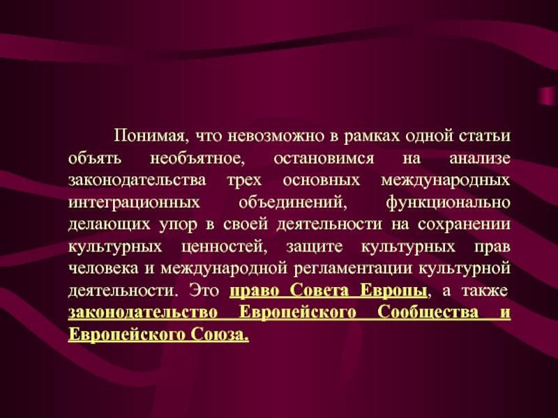 одной статьи объять необъятное, остановимся на анализе законодательства трех основных международных интеграционных объединений, функционально делающих упор в своей деятельности на сохранении культурных ценностей, защите культурных прав человека и международной регламентации культурной деятельности. Это право Совета Европы, а также законодательство Европейского Сообщества и Европейского Союза.