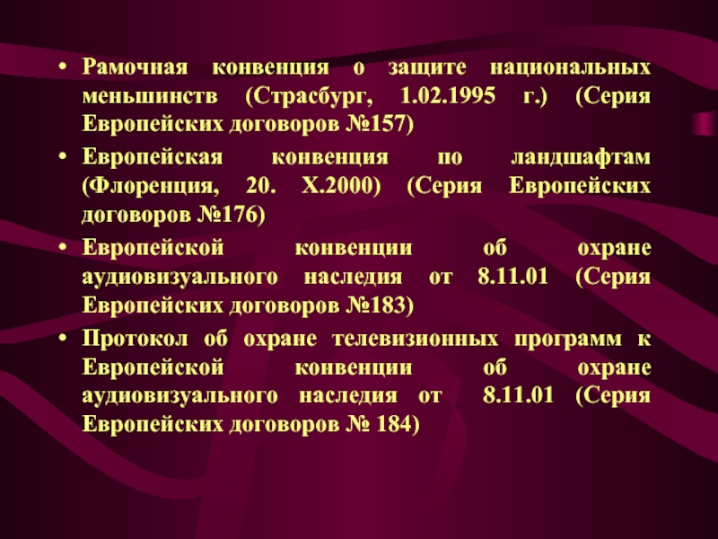 Слайд 29Рамочная конвенция о защите национальных меньшинств (Страсбург, 1.02.1995 г.) (Серия Европейских