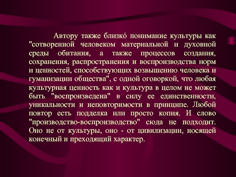 как "сотворенной человеком материальной и духовной среды обитания, а также процессов создания, сохранения, распространения и воспроизводства норм и ценностей, способствующих возвышению человека и гуманизации общества", с одной оговоркой, что любая культурная ценность как и культура в целом не может быть "воспроизведена" в силу ее единственности, уникальности и неповторимости в принципе. Любой повтор есть подделка или просто копия. И слово "производство-воспроизводство" сюда не подходит. Оно не от культуры, оно - от цивилизации, носящей конечный и преходящий характер.