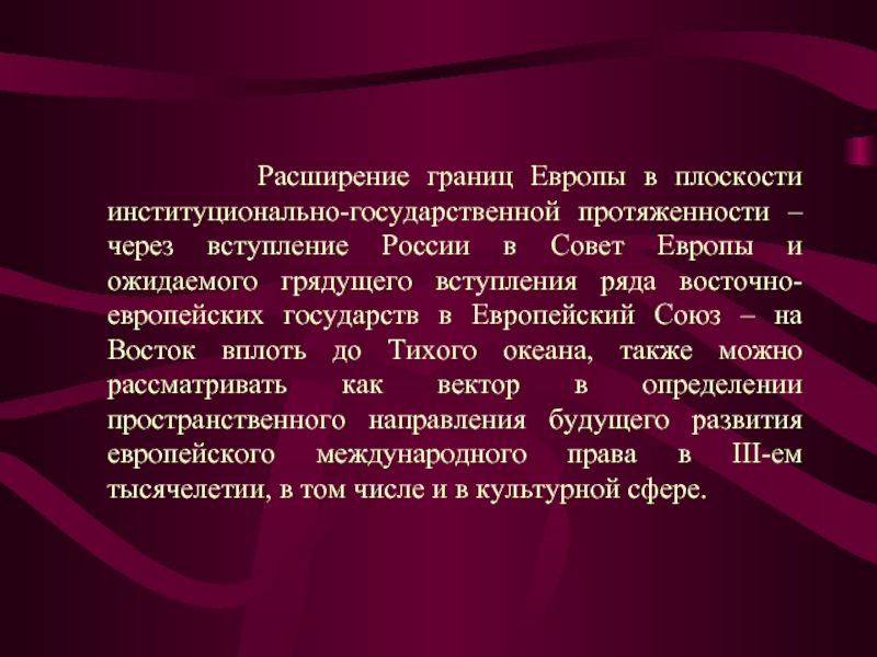 институционально-государственной протяженности – через вступление России в Совет Европы и ожидаемого грядущего вступления ряда восточно-европейских государств в Европейский Союз – на Восток вплоть до Тихого океана, также можно рассматривать как вектор в определении пространственного направления будущего развития европейского международного права в III-ем тысячелетии, в том числе и в культурной сфере.