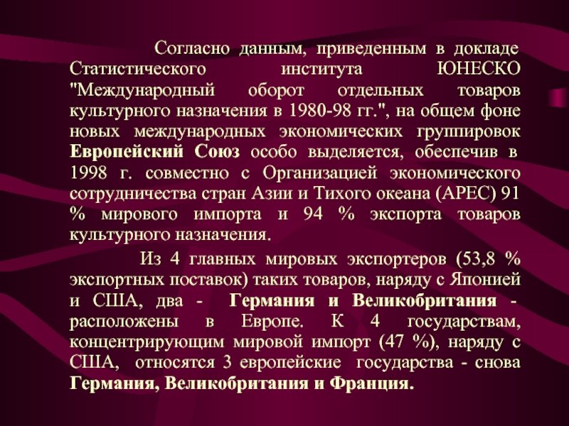 докладе Статистического института ЮНЕСКО "Международный оборот отдельных товаров культурного назначения в 1980-98 гг.", на общем фоне новых международных экономических группировок Европейский Союз особо выделяется, обеспечив в 1998 г. совместно с Организацией экономического сотрудничества стран Азии и Тихого океана (APEC) 91 % мирового импорта и 94 % экспорта товаров культурного назначения.