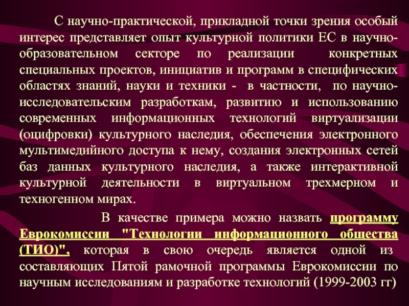 особый интерес представляет опыт культурной политики ЕС в научно-образовательном секторе по реализации конкретных специальных проектов, инициатив и программ в специфических областях знаний, науки и техники - в частности, по научно-исследовательским разработкам, развитию и использованию современных информационных технологий виртуализации (оцифровки) культурного наследия, обеспечения электронного мультимедийного доступа к нему, создания электронных сетей баз данных культурного наследия, а также интерактивной культурной деятельности в виртуальном трехмерном и техногенном мирах.