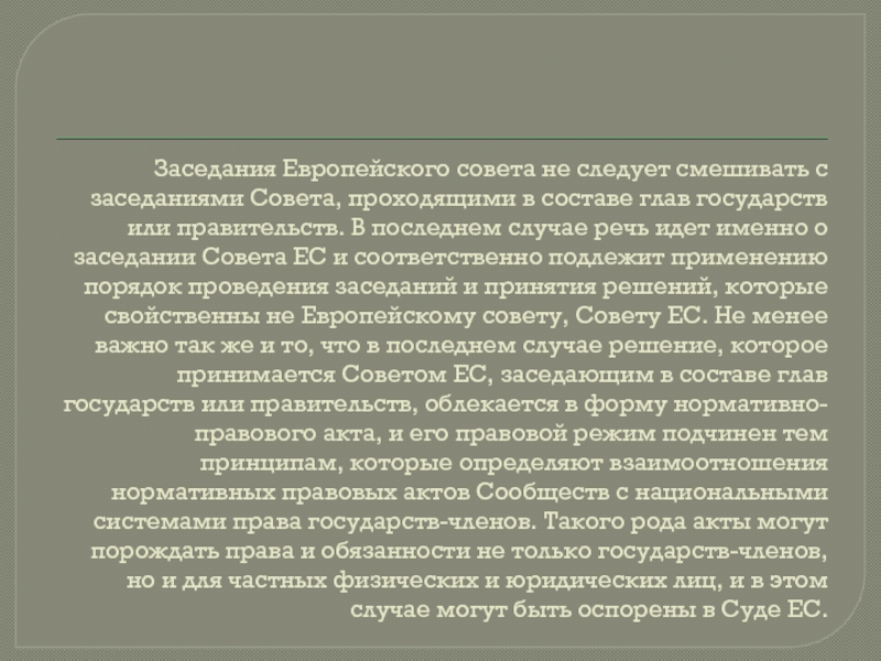составе глав государств или правительств. В последнем случае речь идет именно о заседании Совета ЕС и соответственно подлежит применению порядок проведения заседаний и принятия решений, которые свойственны не Европейскому совету, Совету ЕС. Не менее важно так же и то, что в последнем случае решение, которое принимается Советом ЕС, заседающим в составе глав государств или правительств, облекается в форму нормативно-правового акта, и его правовой режим подчинен тем принципам, которые определяют взаимоотношения нормативных правовых актов Сообществ с национальными системами права государств-членов. Такого рода акты могут порождать права и обязанности не только государств-членов, но и для частных физических и юридических лиц, и в этом случае могут быть оспорены в Суде ЕС.