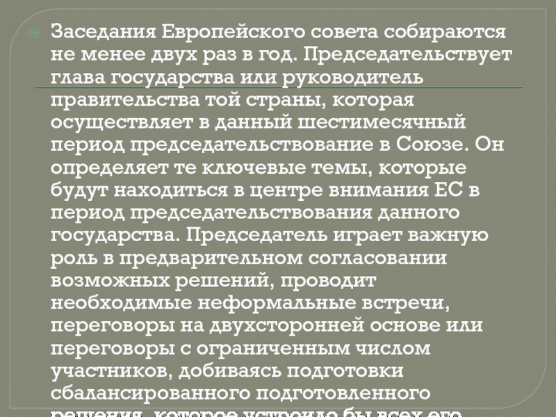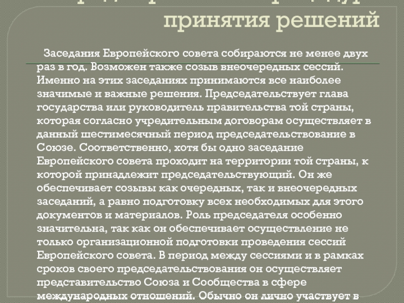 совета собираются не менее двух раз в год. Возможен также созыв внеочередных сессий. Именно на этих заседаниях принимаются все наиболее значимые и важные решения. Председательствует глава государства или руководитель правительства той страны, которая согласно учредительным договорам осуществляет в данный шестимесячный период председательствование в Союзе. Соответственно, хотя бы одно заседание Европейского совета проходит на территории той страны, к которой принадлежит председательствующий. Он же обеспечивает созывы как очередных, так и внеочередных заседаний, а равно подготовку всех необходимых для этого документов и материалов. Роль председателя особенно значительна, так как он обеспечивает осуществление не только организационной подготовки проведения сессий Европейского совета. В период между сессиями и в рамках сроков своего председательствования он осуществляет представительство Союза и Сообщества в сфере международных отношений. Обычно он лично участвует в наиболее важных встречах и переговорах, в которых представлены интеграционные объединения.