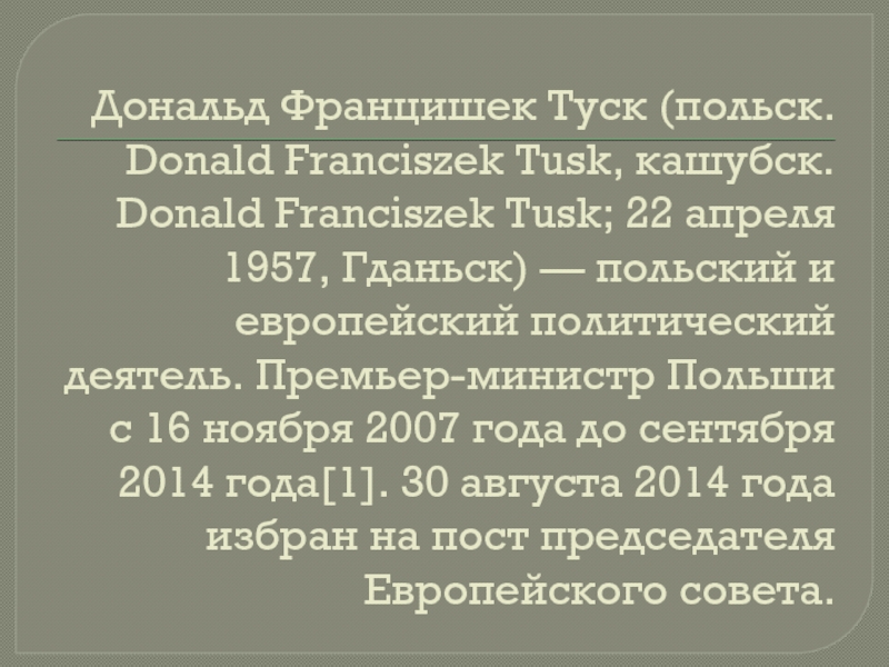 Слайд 15Дональд Францишек Туск (польск. Donald Franciszek Tusk, кашубск. Donald Franciszek Tusk;