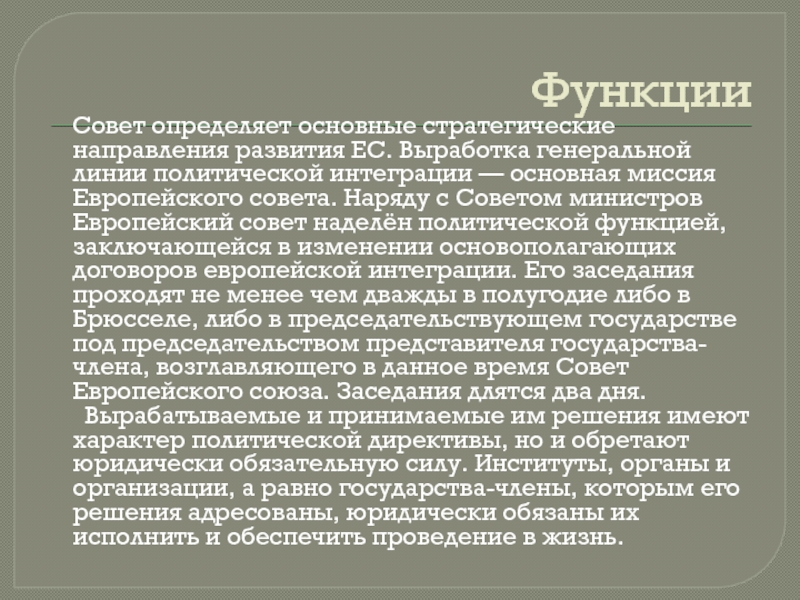 Вырабатываемые и принимаемые им решения имеют характер политической директивы, но и обретают юридически обязательную силу. Институты, органы и организации, а равно государства-члены, которым его решения адресованы, юридически обязаны их исполнить и обеспечить проведение в жизнь.