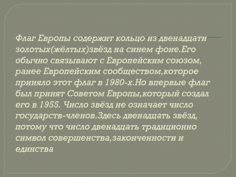Слайд 17Флаг Европы содержит кольцо из двенадцати золотых(жёлтых)звёзд на синем фоне.Его обычно