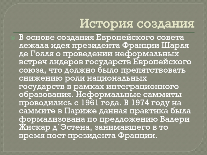 де Голля о проведении неформальных встреч лидеров государств Европейского союза, что должно было препятствовать снижению роли национальных государств в рамках интеграционного образования. Неформальные саммиты проводились с 1961 года. В 1974 году на саммите в Париже данная практика была формализована по предложению Валери Жискар д`Эстена, занимавшего в то время пост президента Франции.