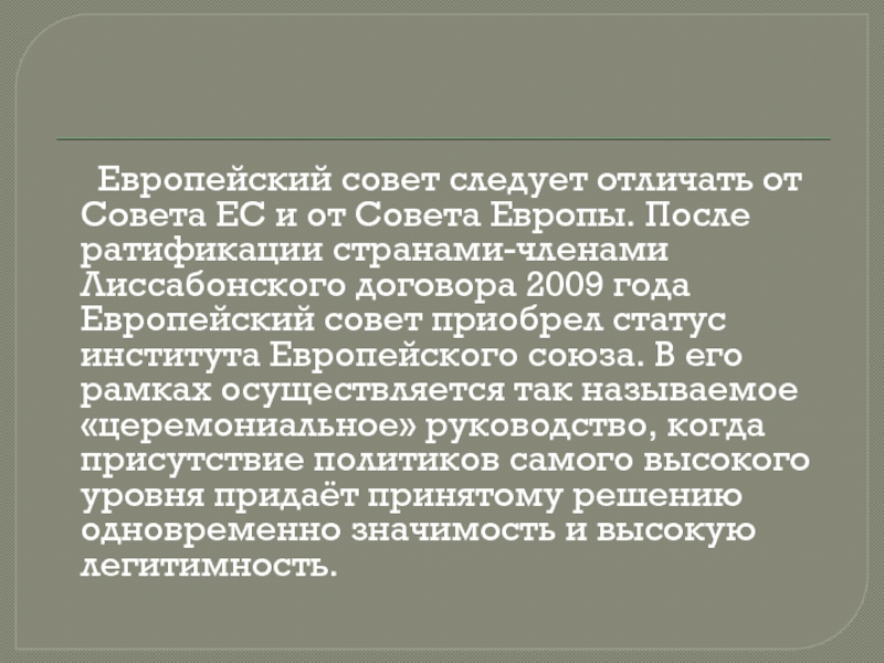 от Совета Европы. После ратификации странами-членами Лиссабонского договора 2009 года Европейский совет приобрел статус института Европейского союза. В его рамках осуществляется так называемое «церемониальное» руководство, когда присутствие политиков самого высокого уровня придаёт принятому решению одновременно значимость и высокую легитимность.