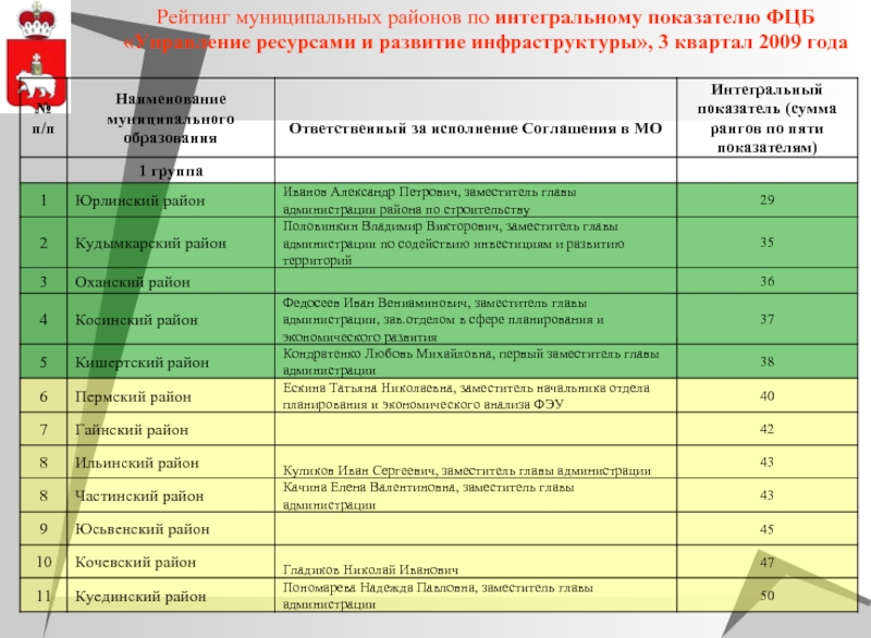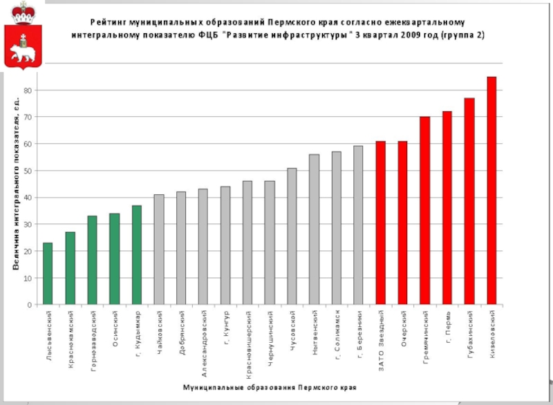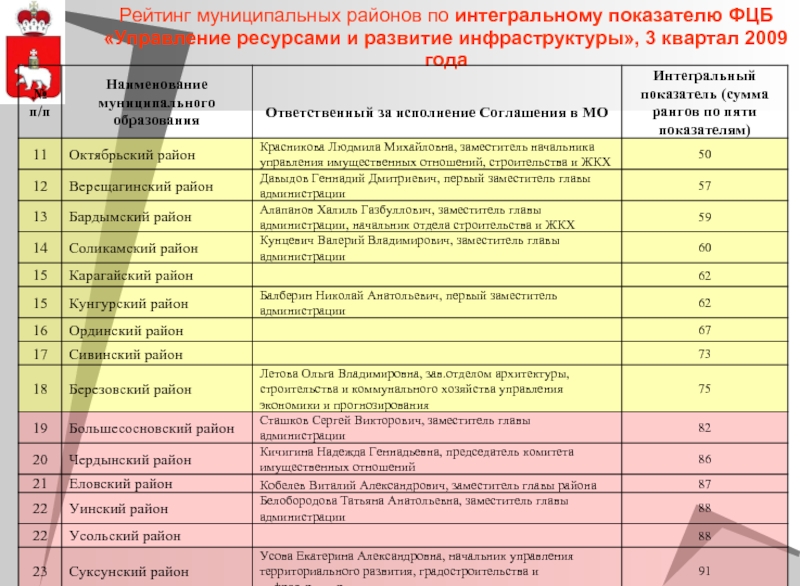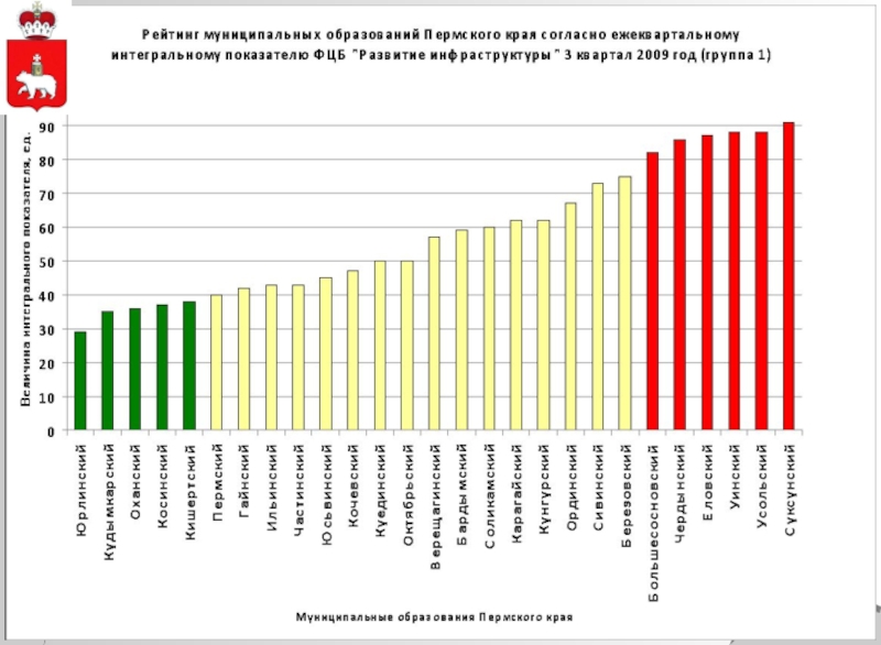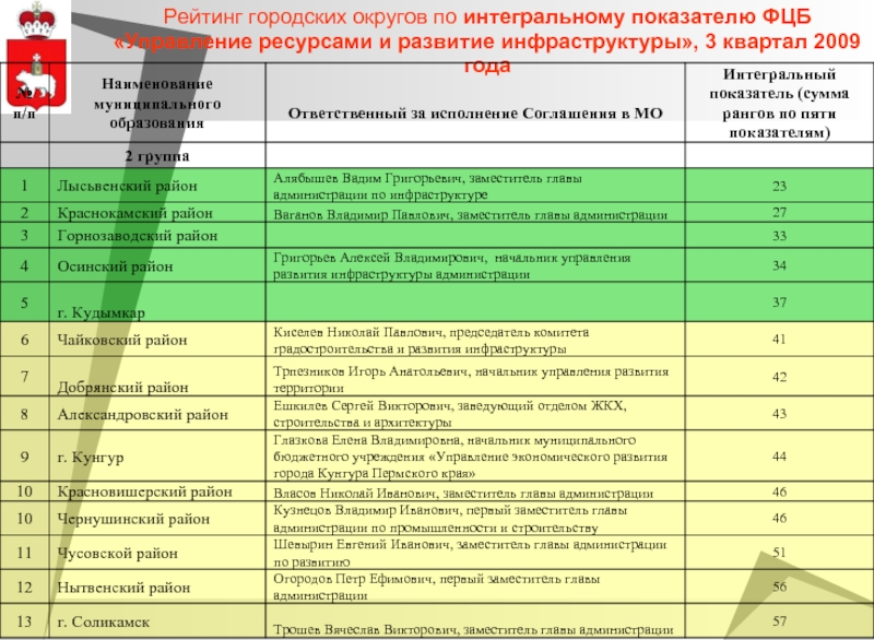Для окончательного ранжирования муниципальных районов и городских округов производится суммирование рангов по отдельным показателям. Лучшими муниципалитетами Пермского края являются те, которые имеют наименьшую сумму рангов.