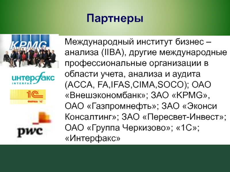 области учета, анализа и аудита (ACCA, FA,IFAS,CIMA,SOCO); ОАО «Внешэкономбанк»; ЗАО «KPMG», ОАО «Газпромнефть»; ЗАО «Эконси Консалтинг»; ЗАО «Пересвет-Инвест»; ОАО «Группа Черкизово»; «1С»; «Интерфакс»