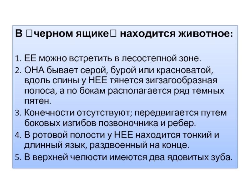 4. В ротовой полости у НЕЕ находится тонкий и длинный язык, раздвоенный на конце.