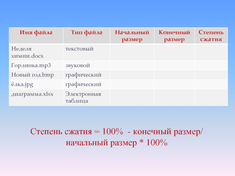 Слайд 9Степень сжатия = 100% - конечный размер/ начальный размер * 100%
