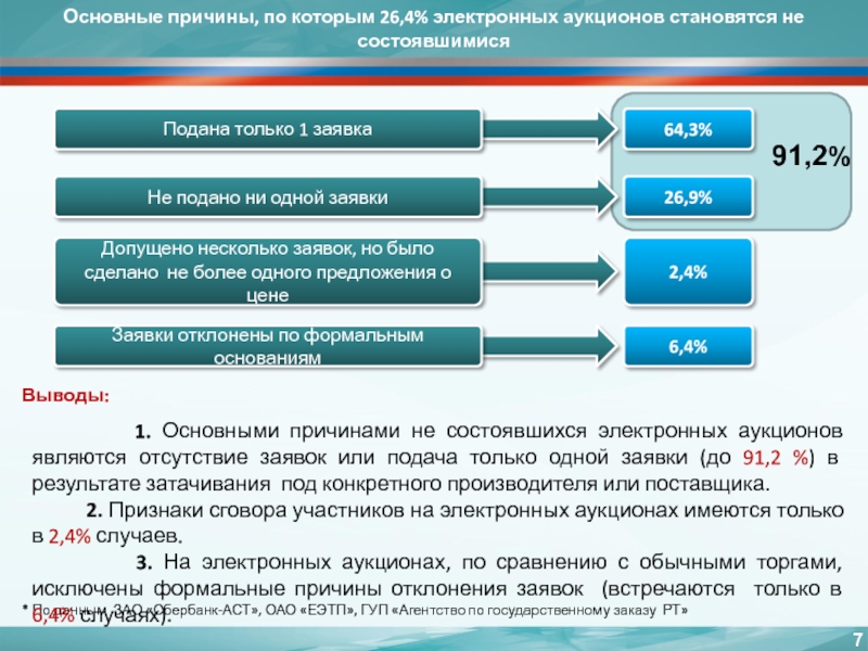 1. Основными причинами не состоявшихся электронных аукционов являются отсутствие заявок или подача только одной заявки (до 91,2 %) в результате затачивания под конкретного производителя или поставщика.