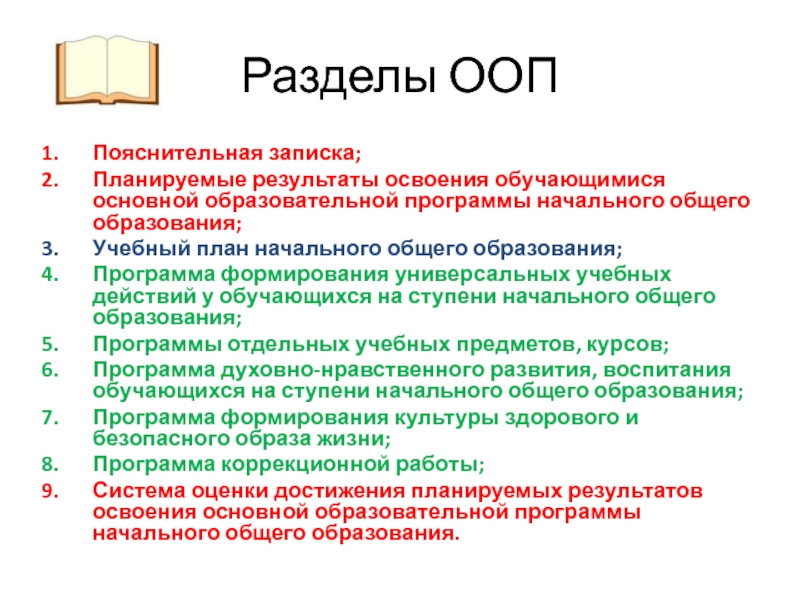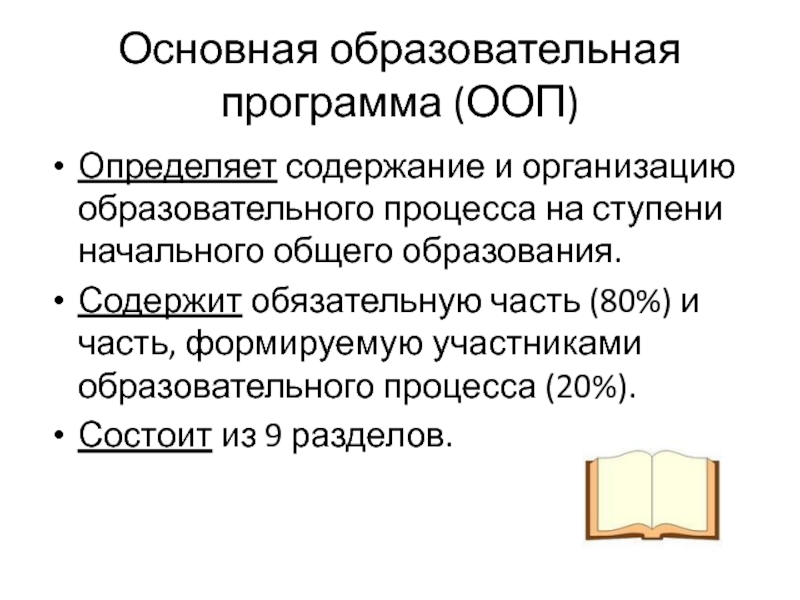 Содержит обязательную часть (80%) и часть, формируемую участниками образовательного процесса (20%).