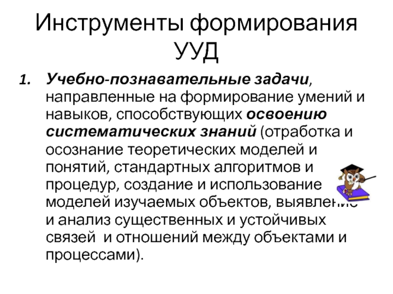 освоению систематических знаний (отработка и осознание теоретических моделей и понятий, стандартных алгоритмов и процедур, создание и использование моделей изучаемых объектов, выявление и анализ существенных и устойчивых связей и отношений между объектами и процессами).