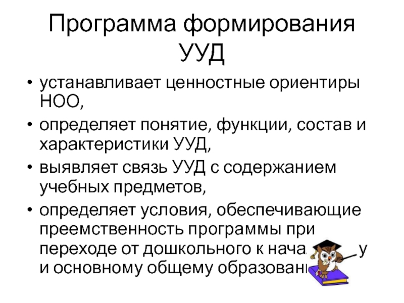 определяет условия, обеспечивающие преемственность программы при переходе от дошкольного к начальному и основному общему образованию.