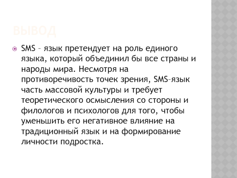 все страны и народы мира. Несмотря на противоречивость точек зрения, SMS–язык часть массовой культуры и требует теоретического осмысления со стороны и филологов и психологов для того, чтобы уменьшить его негативное влияние на традиционный язык и на формирование личности подростка.