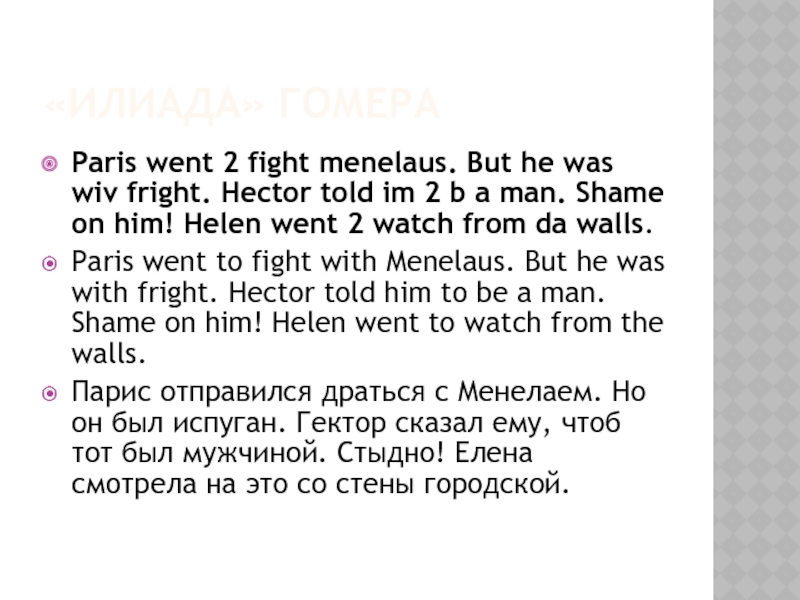 Парис отправился драться с Mенелаем. Но он был испуган. Гектoр сказал ему, чтоб тот был мужчиной. Стыдно! Елена смотрела на это со стены городской.