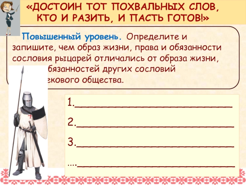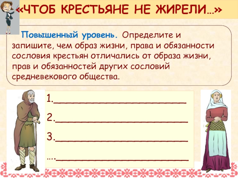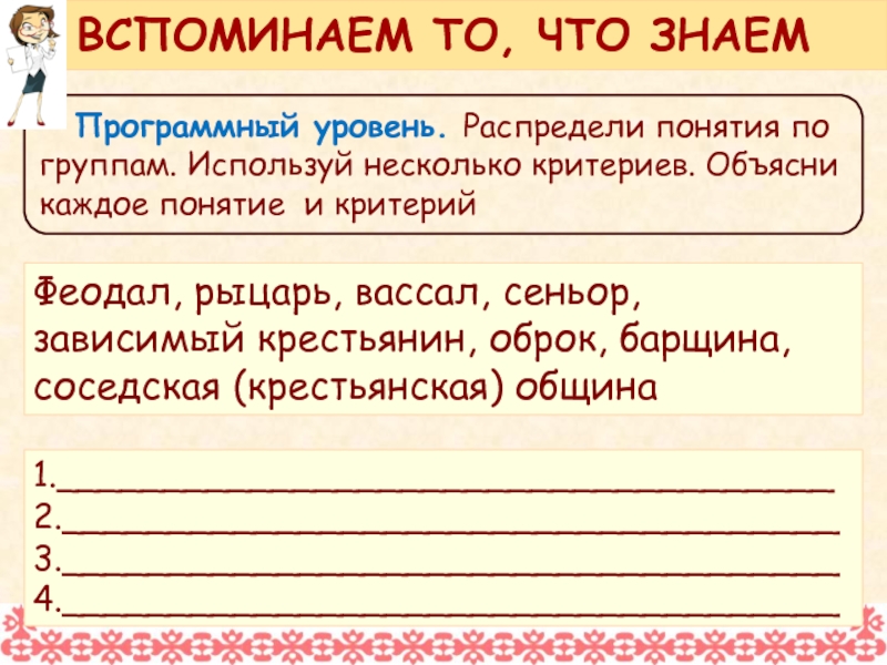 Феодал, рыцарь, вассал, сеньор, зависимый крестьянин, оброк, барщина, соседская (крестьянская) община