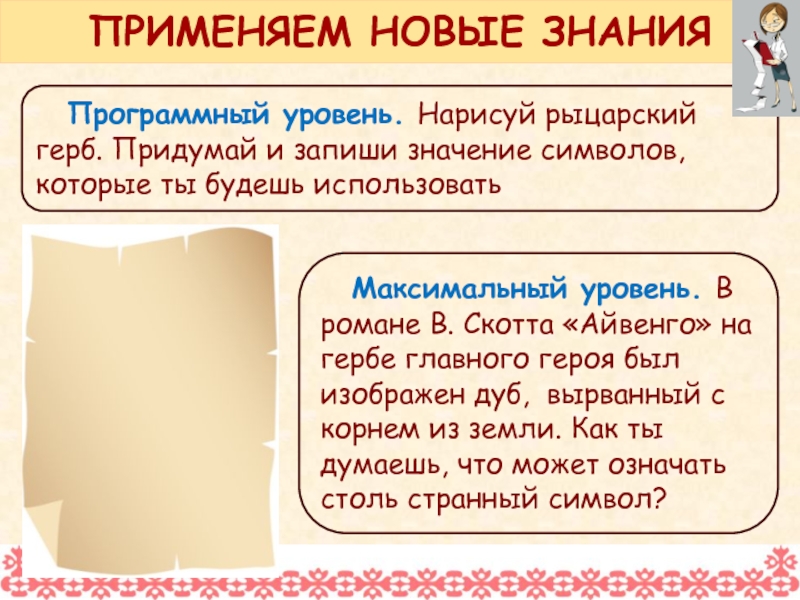 Максимальный уровень. В романе В. Скотта «Айвенго» на гербе главного героя был изображен дуб, вырванный с корнем из земли. Как ты думаешь, что может означать столь странный символ?