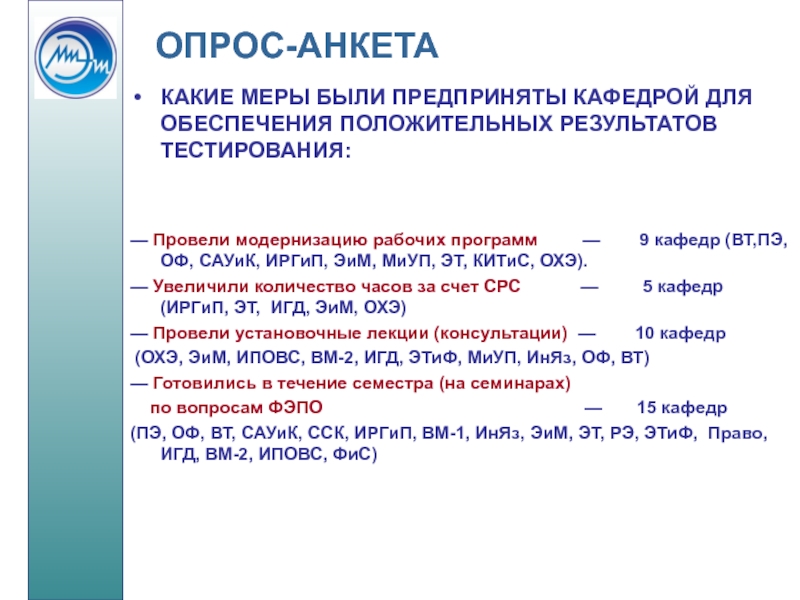КАКИЕ МЕРЫ БЫЛИ ПРЕДПРИНЯТЫ КАФЕДРОЙ ДЛЯ ОБЕСПЕЧЕНИЯ ПОЛОЖИТЕЛЬНЫХ РЕЗУЛЬТАТОВ ТЕСТИРОВАНИЯ: