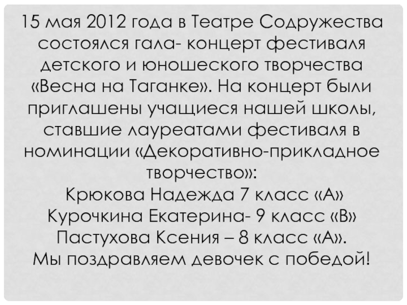 детского и юношеского творчества «Весна на Таганке». На концерт были приглашены учащиеся нашей школы, ставшие лауреатами фестиваля в номинации «Декоративно-прикладное творчество»: