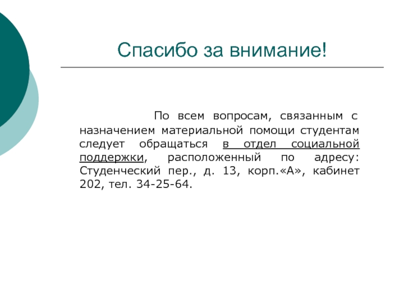 назначением материальной помощи студентам следует обращаться в отдел социальной поддержки, расположенный по адресу: Студенческий пер., д. 13, корп.«А», кабинет 202, тел. 34-25-64.