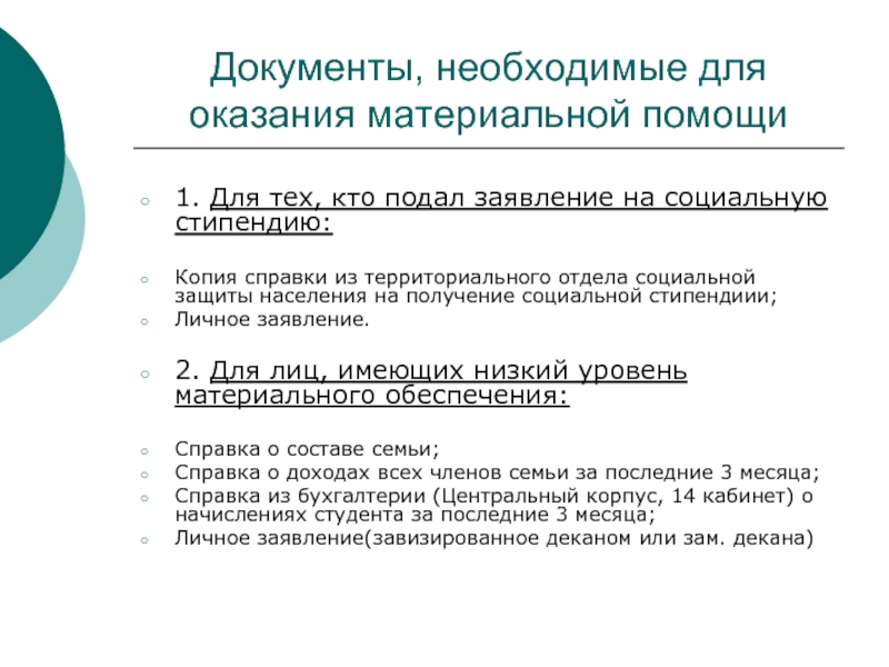 Слайд 3Документы, необходимые для оказания материальной помощи
