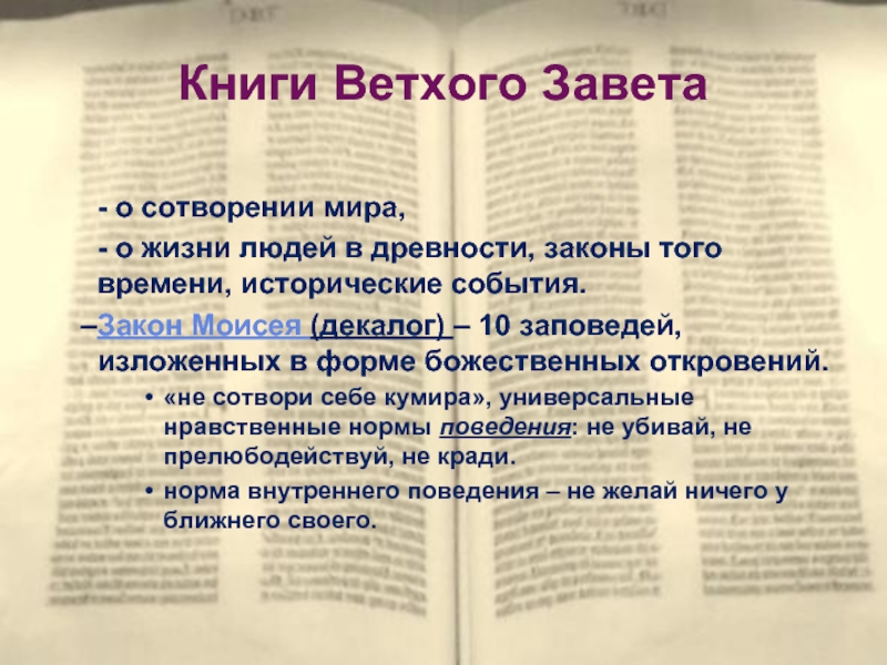 Закон Моисея (декалог) – 10 заповедей, изложенных в форме божественных откровений.