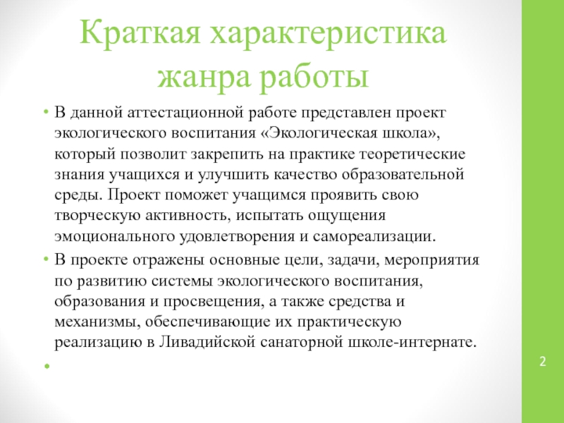 В проекте отражены основные цели, задачи, мероприятия по развитию системы экологического воспитания, образования и просвещения, а также средства и механизмы, обеспечивающие их практическую реализацию в Ливадийской санаторной школе-интернате.