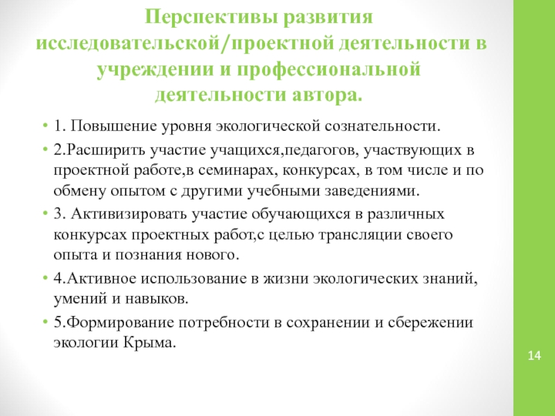 Перспективы развития исследовательской/проектной деятельности в учреждении и профессиональной деятельности автора.