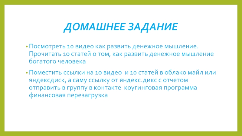 Поместить ссылки на 10 видео и 10 статей в облако майл или яндексдиск, а саму ссылку от яндекс.дикс с отчетом отправить в группу в контакте коугинговая программа финансовая перезагрузка