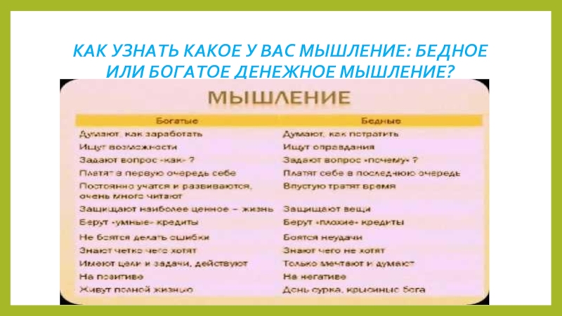 Слайд 4КАК УЗНАТЬ КАКОЕ У ВАС МЫШЛЕНИЕ: БЕДНОЕ ИЛИ БОГАТОЕ ДЕНЕЖНОЕ МЫШЛЕНИЕ?