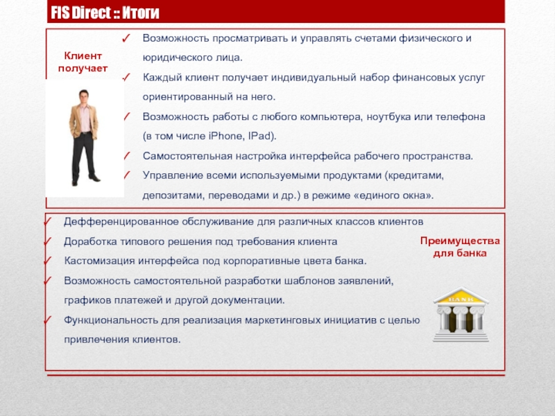 FIS Direct поддерживает интеграцию с различными АБС, а также с карточными процессингами, платежными системами и т.д.)