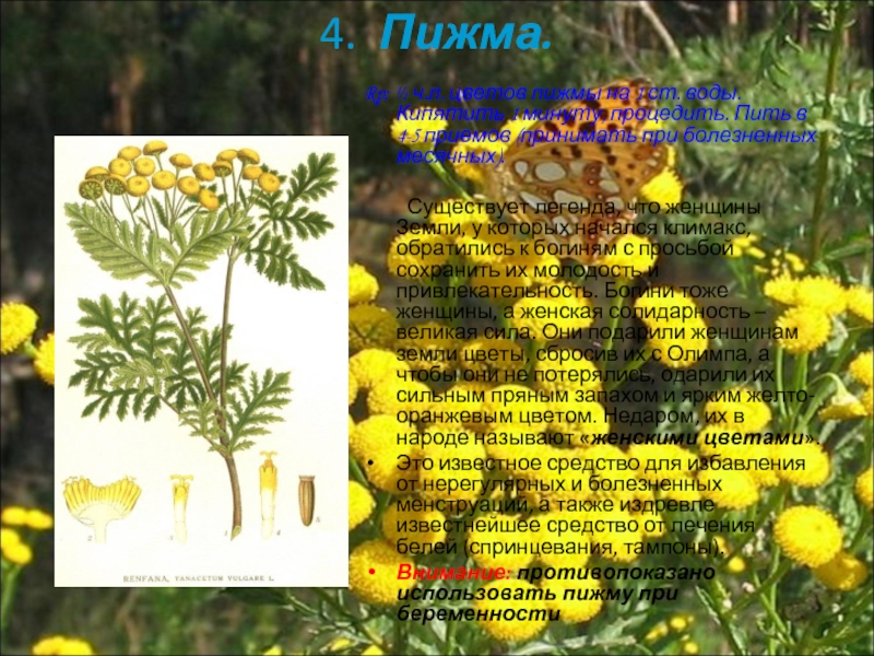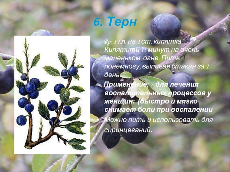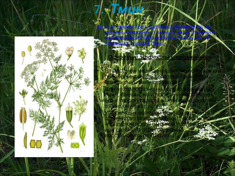 Rp: 1 ст.л. травы на 1 ст. кипятка. настаивать 20 минут процедить и пить по ¼ ст. 2 раза в день утром и перед сном