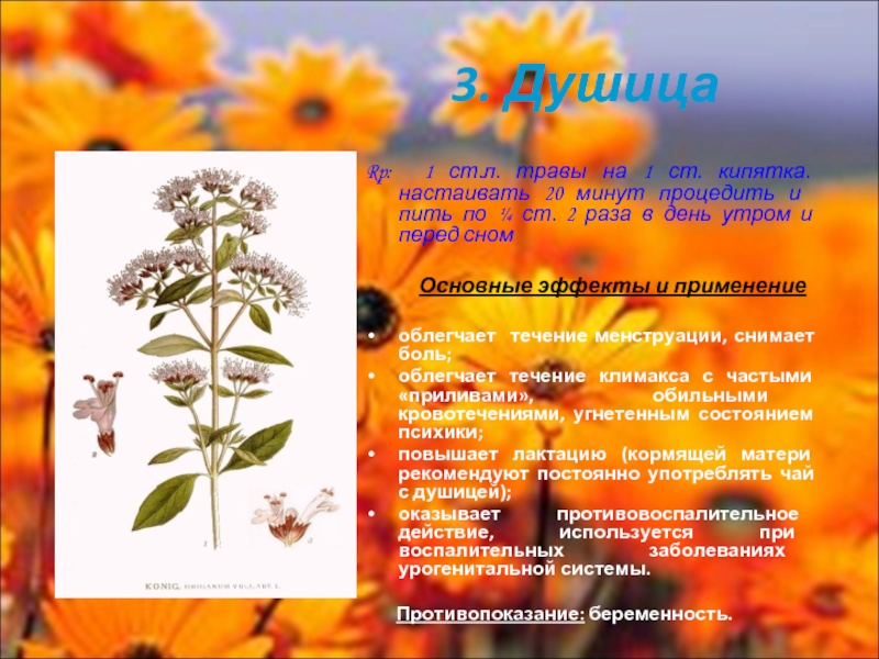 повышает лактацию (кормящей матери рекомендуют постоянно употреблять чай с душицей);