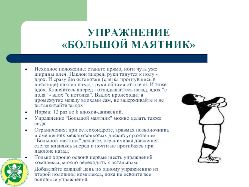 Ограничения: при остеохондрозе, травмах позвоночника и смещениях межпозвонковых дисков упражнение "Большой маятник" делайте, ограничивая движения: слегка кланяясь вперед и почти не прогибаясь при наклоне назад.