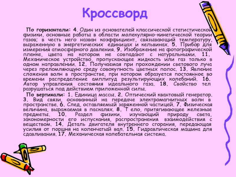 По вертикали: 1. Единица массы. 2. Оптический квантовый генератор. 3. Вид связи, основанный на передаче электромагнитных волн в пространстве. 6. След, оставляемый заряженной частицей. 7. Физическая величина, выражаемая в паскалях. 8. Т ело, притягивающее железные предметы. 10. Раздел физики, изучающий природу света, закономерности его испускания, распространения  взаимодействия с веществом. 14. Деталь двигателя внутреннего сгорания, передающая усилия от поршня на коленчатый вал. 15. Гидравлическая машина для сдавливания. 17. Механическая колебательная система.