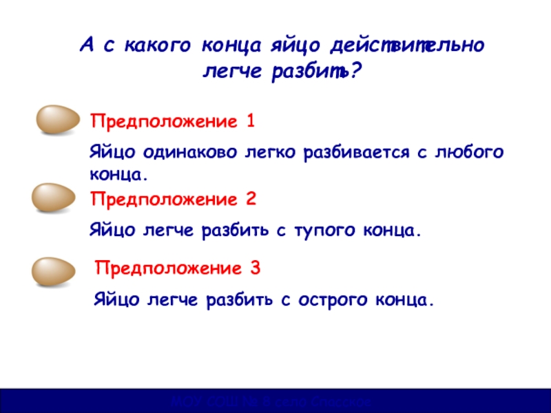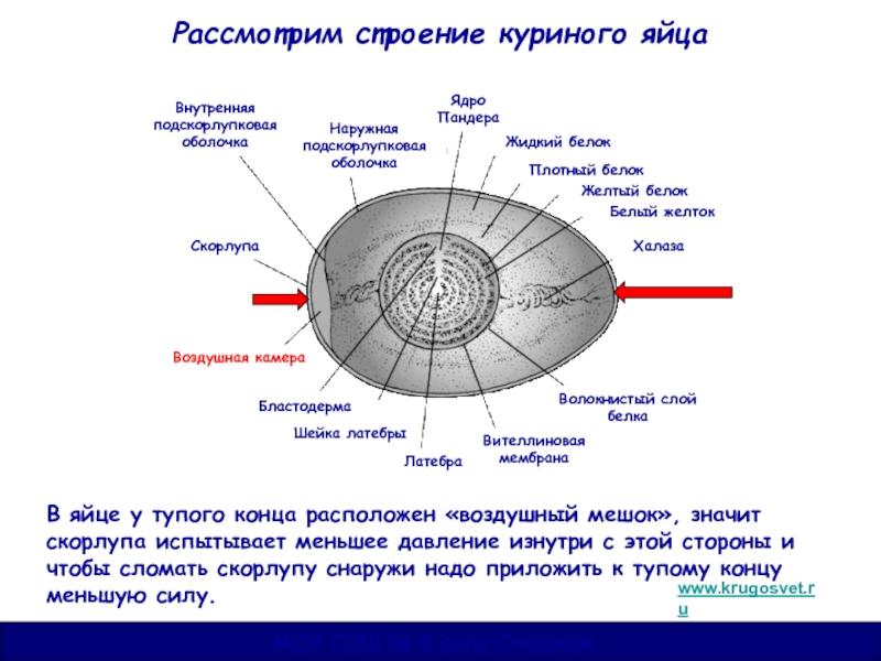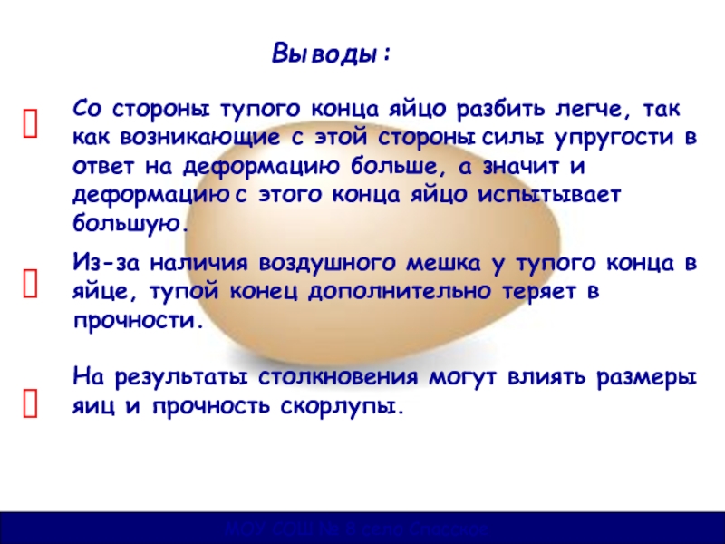 Из-за наличия воздушного мешка у тупого конца в яйце, тупой конец дополнительно теряет в прочности.