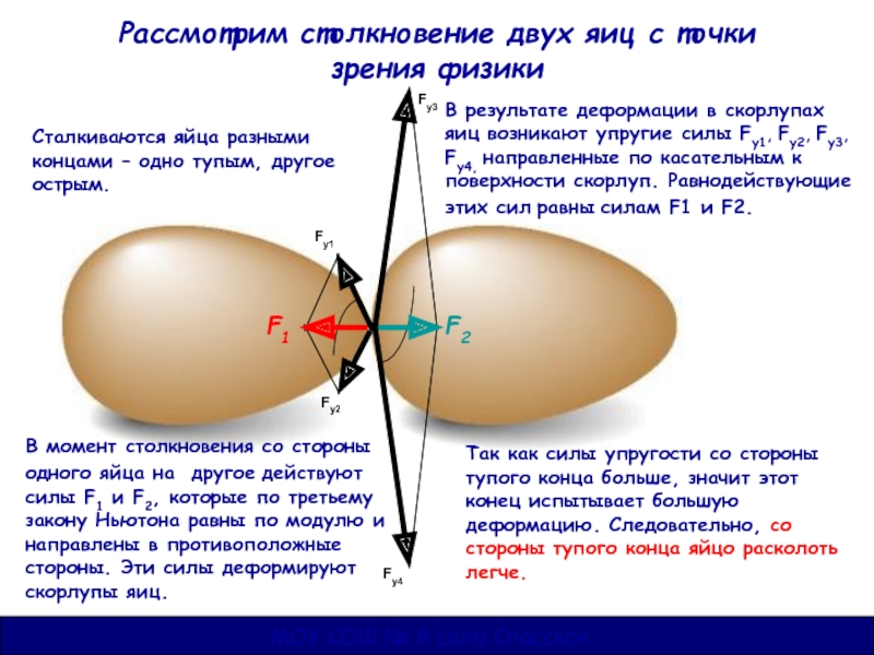 В результате деформации в скорлупах яиц возникают упругие силы Fу1, Fу2, Fу3, Fу4, направленные по касательным к поверхности скорлуп. Равнодействующие этих сил равны силам F1 и F2.