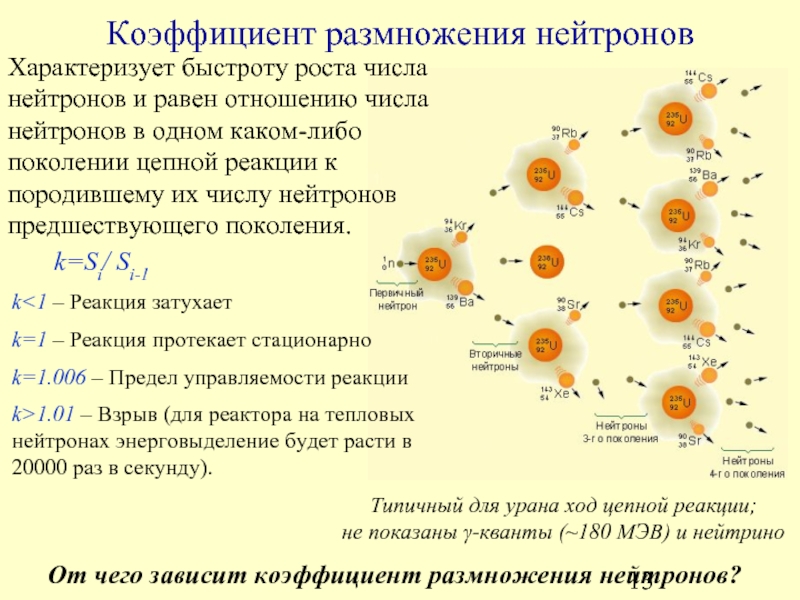 Характеризует быстроту роста числа нейтронов и равен отношению числа нейтронов в одном каком-либо поколении цепной реакции к породившему их числу нейтронов предшествующего поколения.
