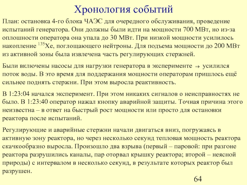 генератора. Они должны были идти на мощности 700 МВт, но из-за оплошности оператора она упала до 30 МВт. При низкой мощности усилилось накопление 135Хе, поглощающего нейтроны. Для подъема мощности до 200 МВт из активной зоны была извлечена часть регулирующих стержней.