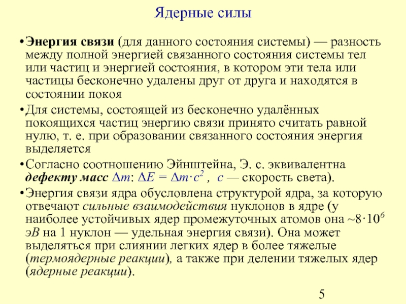 Энергия связи ядра обусловлена структурой ядра, за которую отвечают сильные взаимодействия нуклонов в ядре (у наиболее устойчивых ядер промежуточных атомов она ~8·106 эВ на 1 нуклон — удельная энергия связи). Она может выделяться при слиянии легких ядер в более тяжелые (термоядерные реакции), а также при делении тяжелых ядер (ядерные реакции).