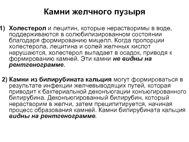в солюбилизированном состоянии благодаря формированию мицелл. Когда пропорции холестерола, лецитина и солей желчных кислот нарушаются, холестерол выпадает в осадок, приводя к формированию камней. Эти камни не видны на рентгенограмме.